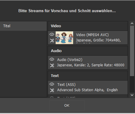 5. Nach dem Öffnen der Datei wird das Fenster "Bitte Streams für Vorschau und Schnitt auswählen " angezeigt. Sie können dieses Fenster auch über das Menü Steuerung / "Streams auswählen..." öffnen.