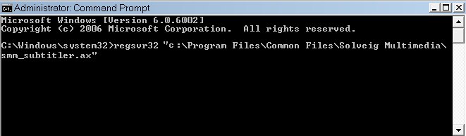 - Geben Sie die Befehlszeichenfolge wie in Abbildung 2 gezeigt ein. Der vollständige Pfad zum Filter (smm_subtitler.ax) muss in doppelte Anführungszeichen geschrieben werden.