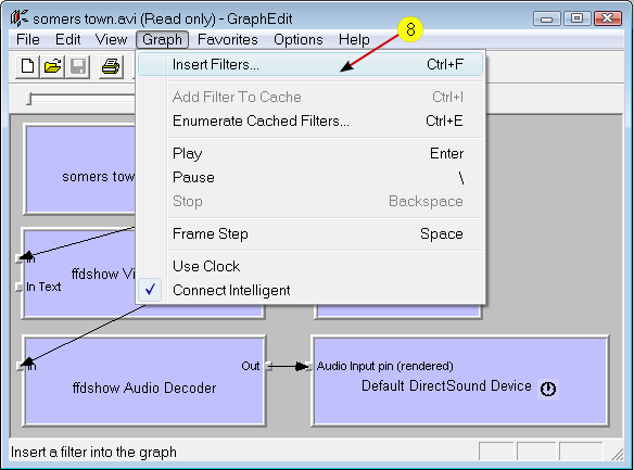 8. Fügen Sie den SolveigMM Subtitler-Filter in das Diagramm ein. Wählen Sie dazu den Eintrag Filter einfügen aus dem Hauptmenü von Diagramm bearbeiten (Abbildung 5). Das Fenster “Welche Filter möchten Sie einfügen? ” wird geöffnet (Abbildung 6).