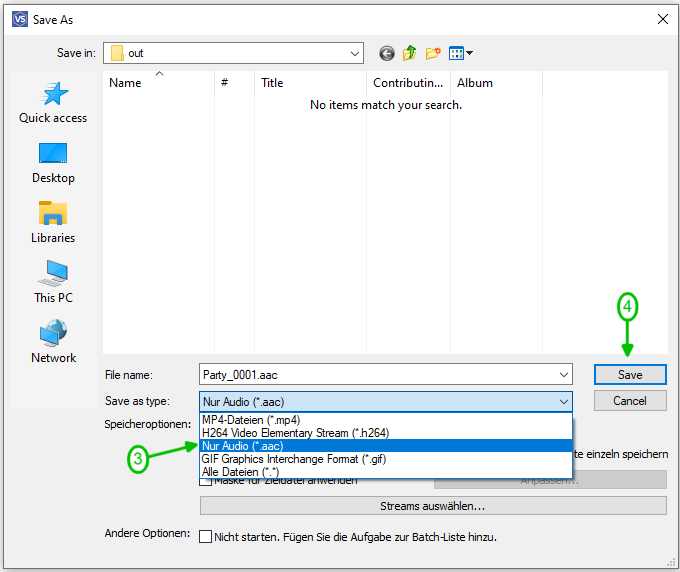 4. Stellen Sie sicher, dass Sie «Nur Audio» als Dateitypfilter verwenden, der zum Extrahieren des Audios erforderlich ist. Wählen Sie den Speicherort, an dem Sie das fertige Produkt speichern möchten.