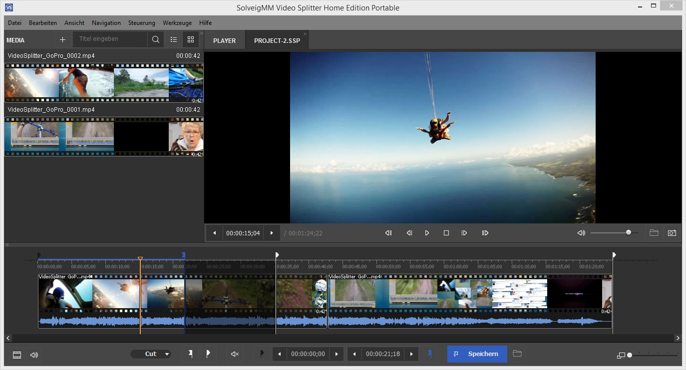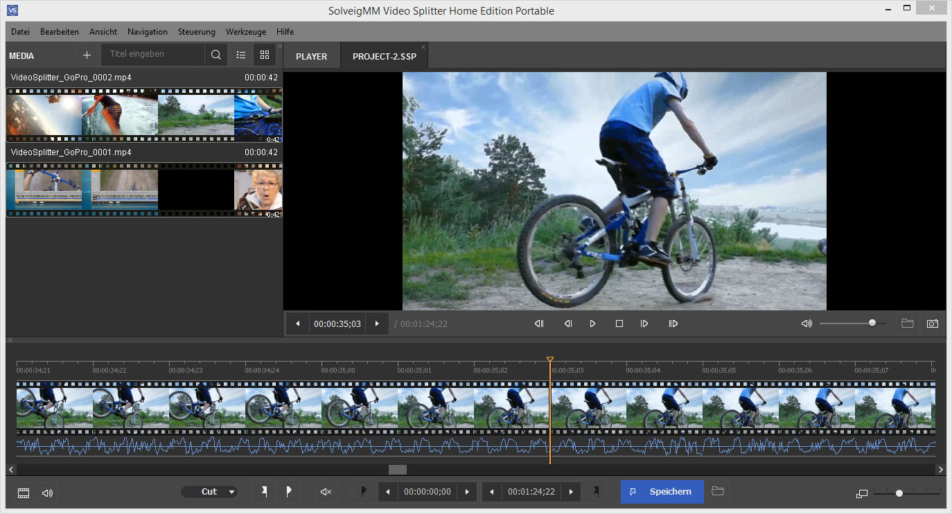 Wenn Sie eine Videodatei in mehrere Einzeldateien aufteilen oder ein bestimmtes Fragment herausschneiden wollen, können Sie das mit SolveigMM Video Splitter schnell durchführen. Entscheidend ist dabei – und das unterscheidet SolveigMM Video Splitter von anderen Programmen -, dass die Qualität Ihres Videos unverändert bleibt. SolveigMM Video Splitter erledigt diese Aufgabe unkompliziert, schnell und ohne Qualitätsverlust!