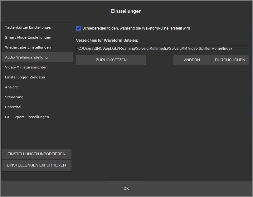"Verzeichnis für Waveform-Dateien" legt das Verzeichnis für den Waveform Data Cache fest, den Video Splitter verwendet. Sie können den Pfad für das Verzeichnis ändern, wenn Sie freien Platz auf dem vorgeschlagenen Laufwerk schaffen wollen.