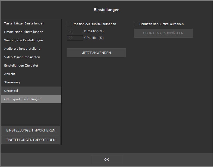 Im "Untertitel"-Reiter können Sie Einstellungen für die Platzierung von Untertiteln und der Schriftart anpassen.
