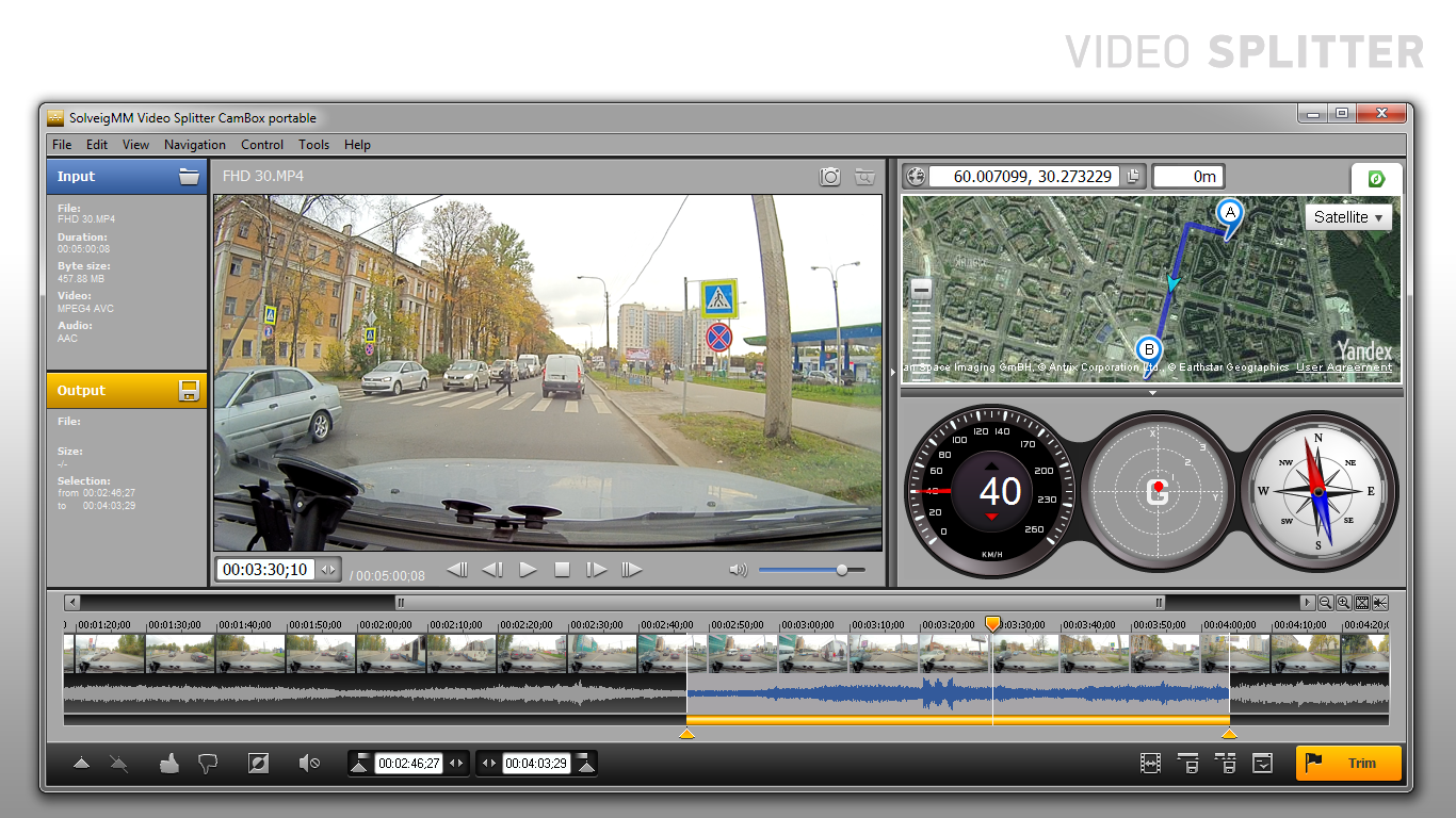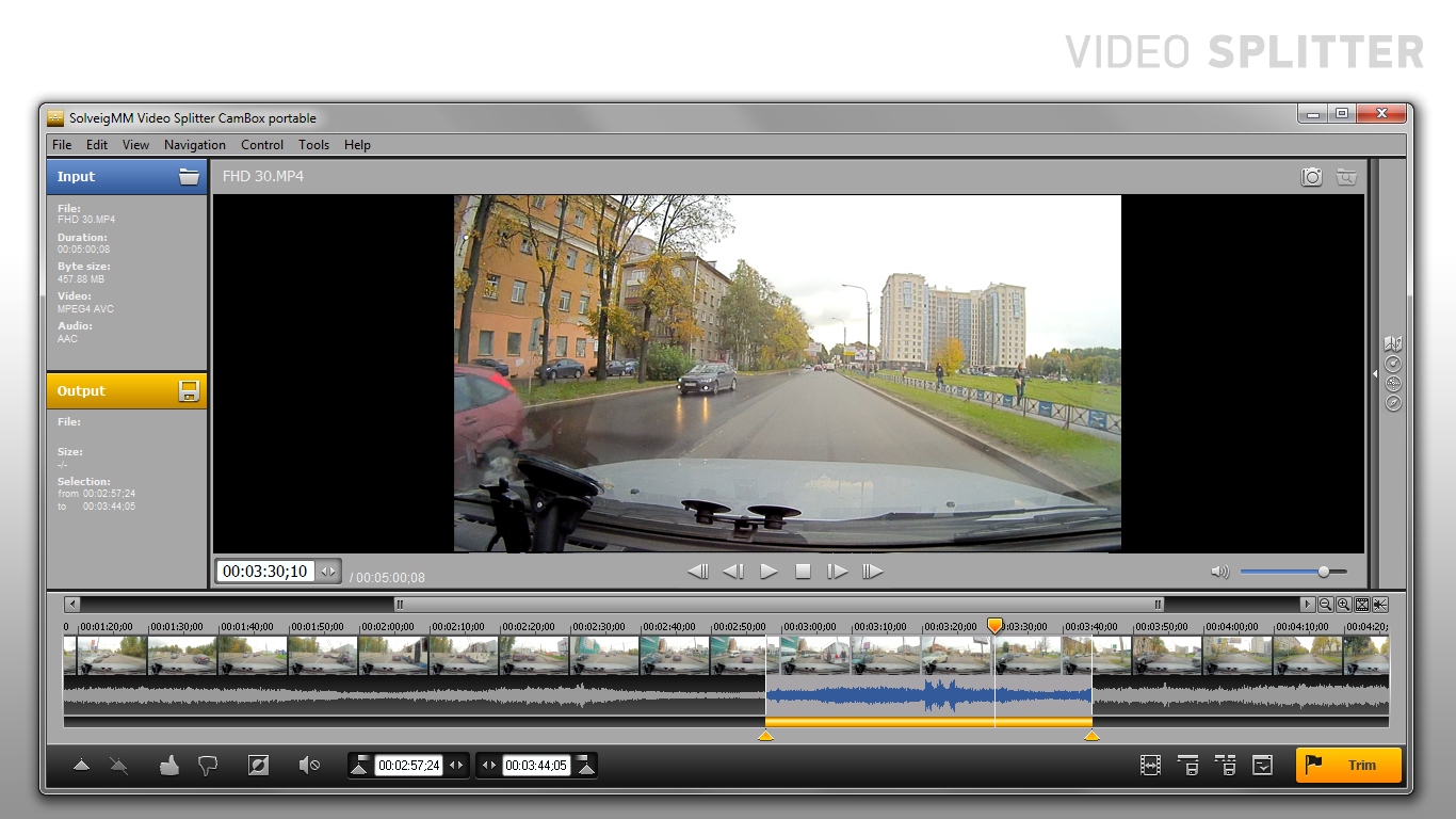 Offering true lossless editing of compressed video streams, SolveigMM Video Splitter CamBox is head and shoulders above the crowded market of AV splitters, joiners and converters. The powerful video / audio editor makes it easy to split, join, delete or save a separate video/audio track in compressed DETALECO CamBox CE and CamBox Drive car video recorders MP4 files.