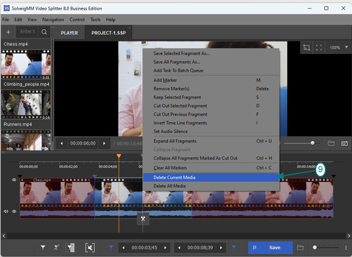 8. Delete the file from the timeline by right mouse click and selecting the "Delete current Media".