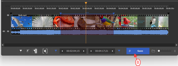 Per trovare facilmente la fine e l'inizio del fotogramma utilizzare i pulsanti "Zoom avanti/indietro" per modificare la scala della linea temporale visiva.